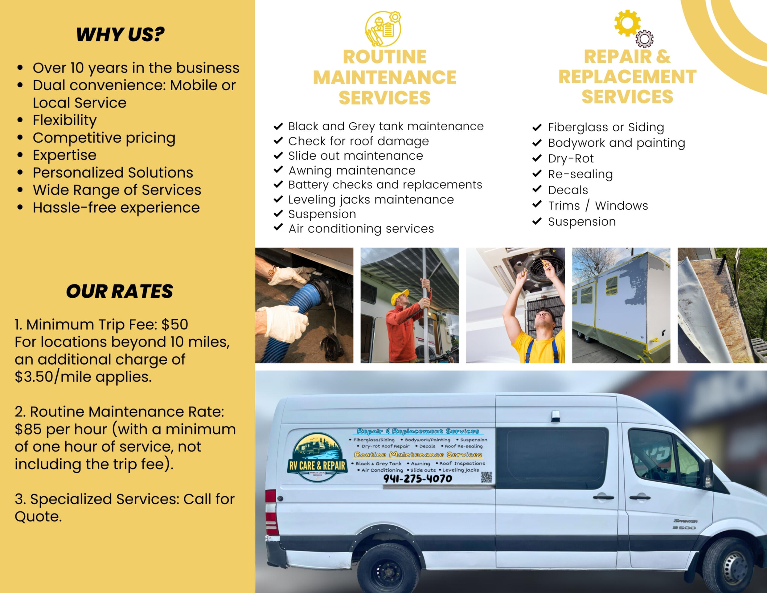 Facing issues like roof leaks, soft floor spots, malfunctioning AC, awning fabric needs replacement, fiberglass damage, or worn decals?